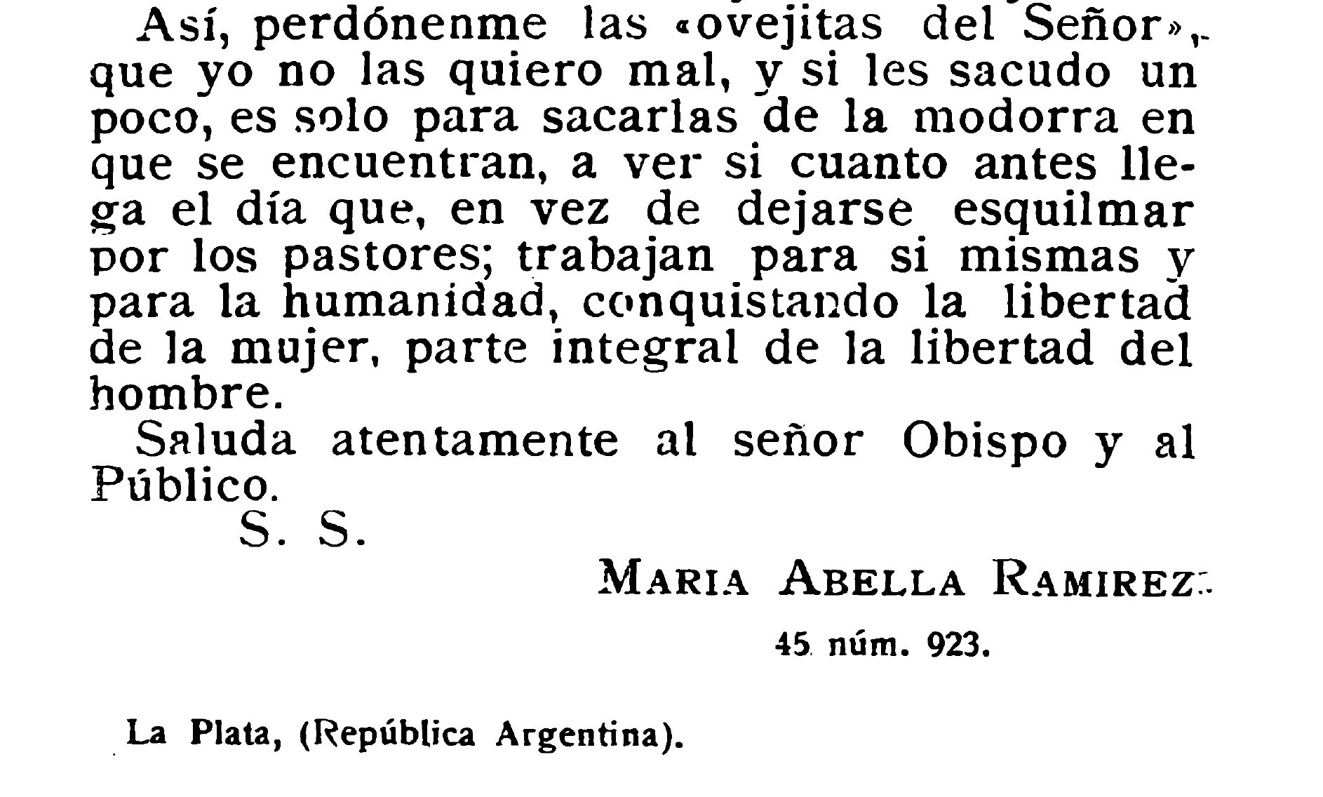 Esta carta es una poderosa suma de transgresiones. La primera es de su propia forma, una carta que no guarda la intimidad entre remitente y destinatario, sino que se hace pública y abierta a toda clase de lecturas. Luego, su firma, porque la que escribe es una mujer, y para las primeras décadas del siglo XX eso era, todavía, una figura socialmente subordinada, económicamente dependiente y jurídicamente minorizada. Además, se trata de un texto de crítica directa a la Iglesia Católica Apostólica Romana y a una de sus principales autoridades locales, el mismísimo Obispo de la Provincia de Buenos Aires. La diatriba no se detiene en “el pastor del rebaño provincial”, sino que escala hasta el corazón del ideario católico incluyendo todas sus instituciones y sus textos. La autora de esta carta rabiosa es María Abella, uruguaya de nacimiento (San José, 28/9/1863), viuda y casada en segundas nupcias con el escribano argentino Antonio Ramírez. Fue madre de siete hijos e hijas, a quienes hizo partícipes de su intensa vida como feminista librepensadora en la ciudad de La Plata (donde murió en 1926).