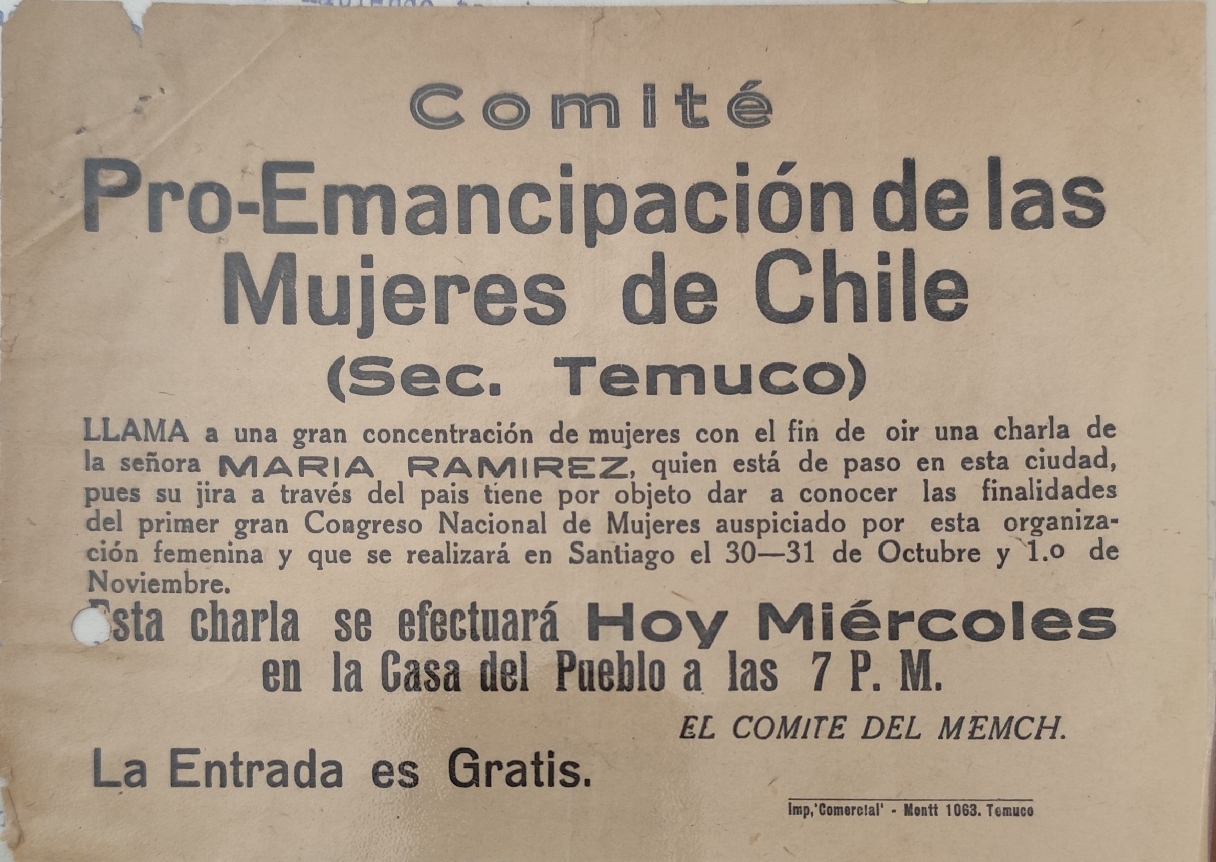 El Movimiento Pro-Emancipación de las Mujeres de Chile fue una organización política y social fundada el 11 de abril de 1935 por un grupo de mujeres de diversas clases sociales, oficios, militancias y edades que “unidas por una voluntad democrática amplia” (Antología MEMCh, 1982, 3), se propusieron trabajar en favor de los derechos de las mujeres y la niñez, y contra la guerra y el fascismo. Activado por la periodista Marta Vergara, delegada chilena en la Comisión de Derechos de la Mujer de la Liga de las Naciones en 1934, y la abogada Elena Caffarena ‑una de las cuatro primeras mujeres en incorporarse a la Federación de Estudiantes de Chile (FECH)-, el MEMCh fue, en palabras de sus dirigentas, “el primer movimiento femenino organizado militante, con permanencia y continuidad en el tiempo” (Antología MEMCh, 1982, 2). Su creación se inscribe en un contexto nacional marcado por la persistencia de la crisis social y la inestabilidad política de la década de 1930, el recrudecimiento de la represión al movimiento obrero durante la dictadura de Carlos Ibáñez y la emergencia del fascismo a nivel global; pero también, a la acumulación histórica derivada de las luchas emancipatorias del movimiento popular y del feminismo panamericano. El MEMCh fue, en definitiva, “la más importante organización feminista de la historia chilena” (Illanes, 2012, 30).